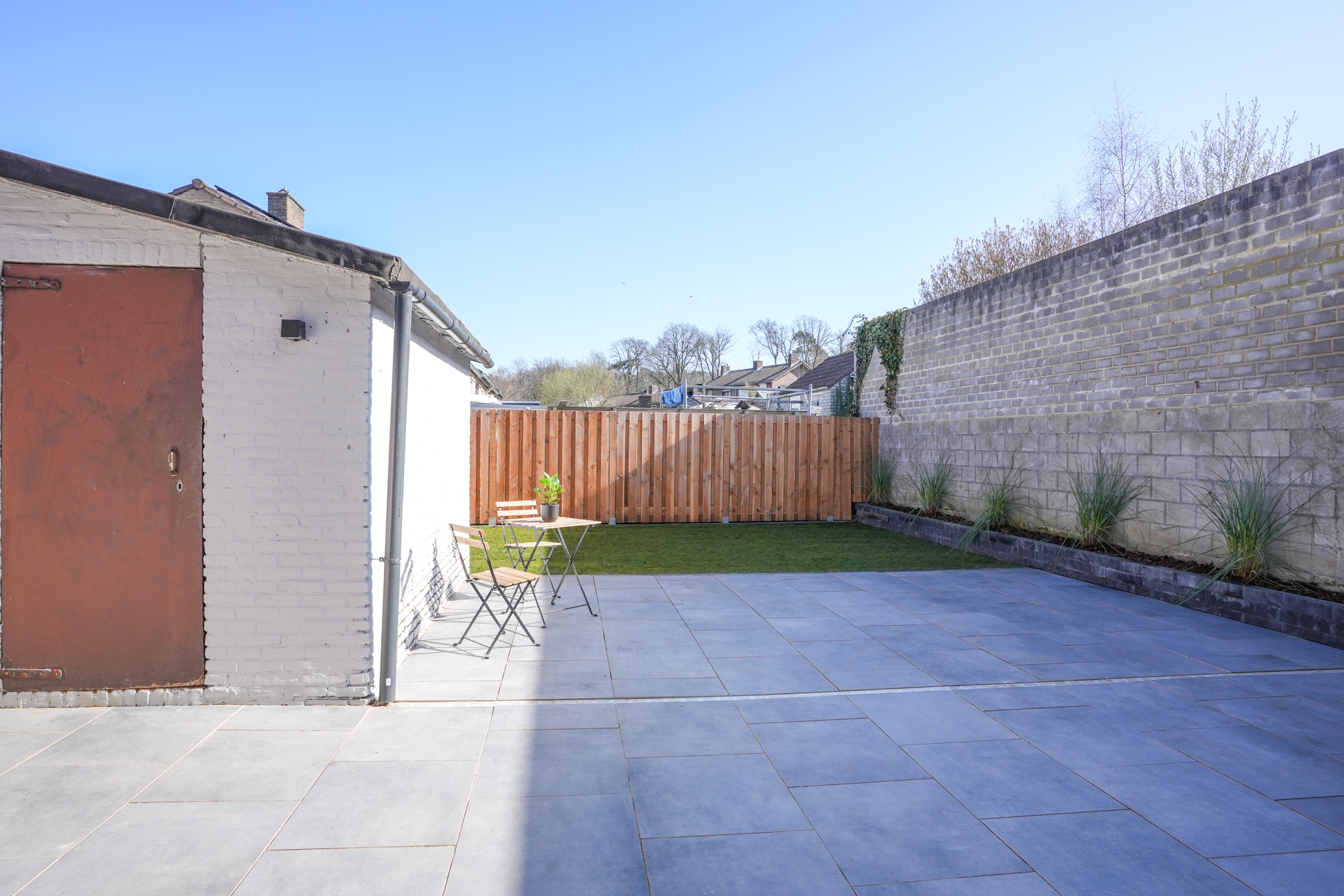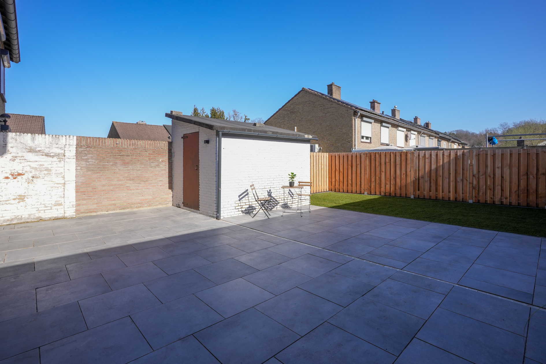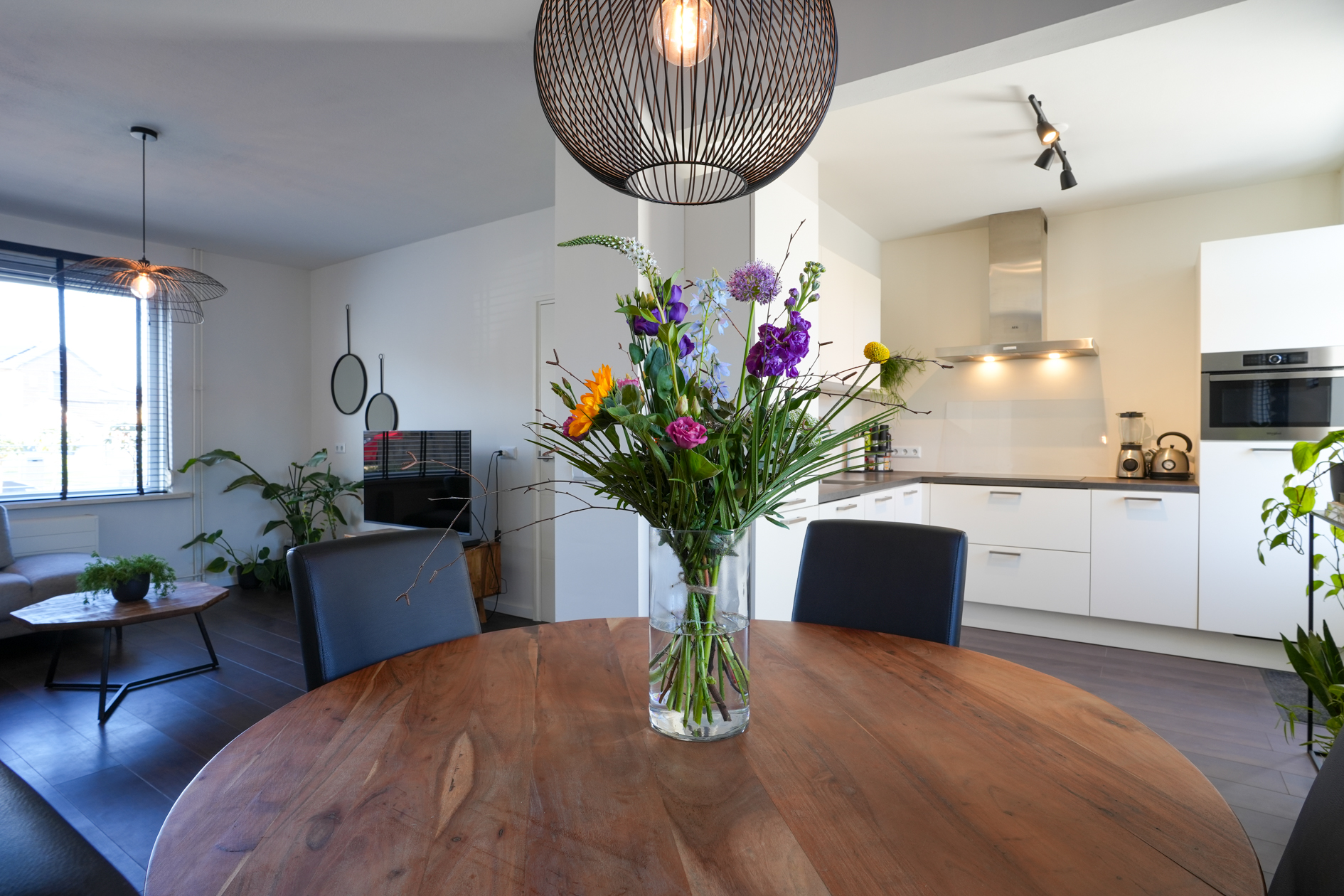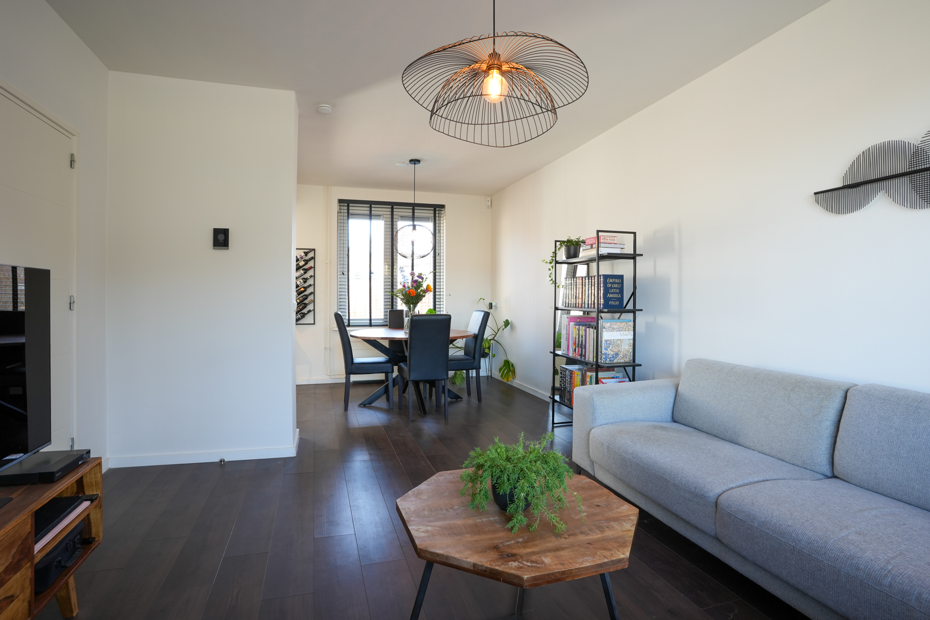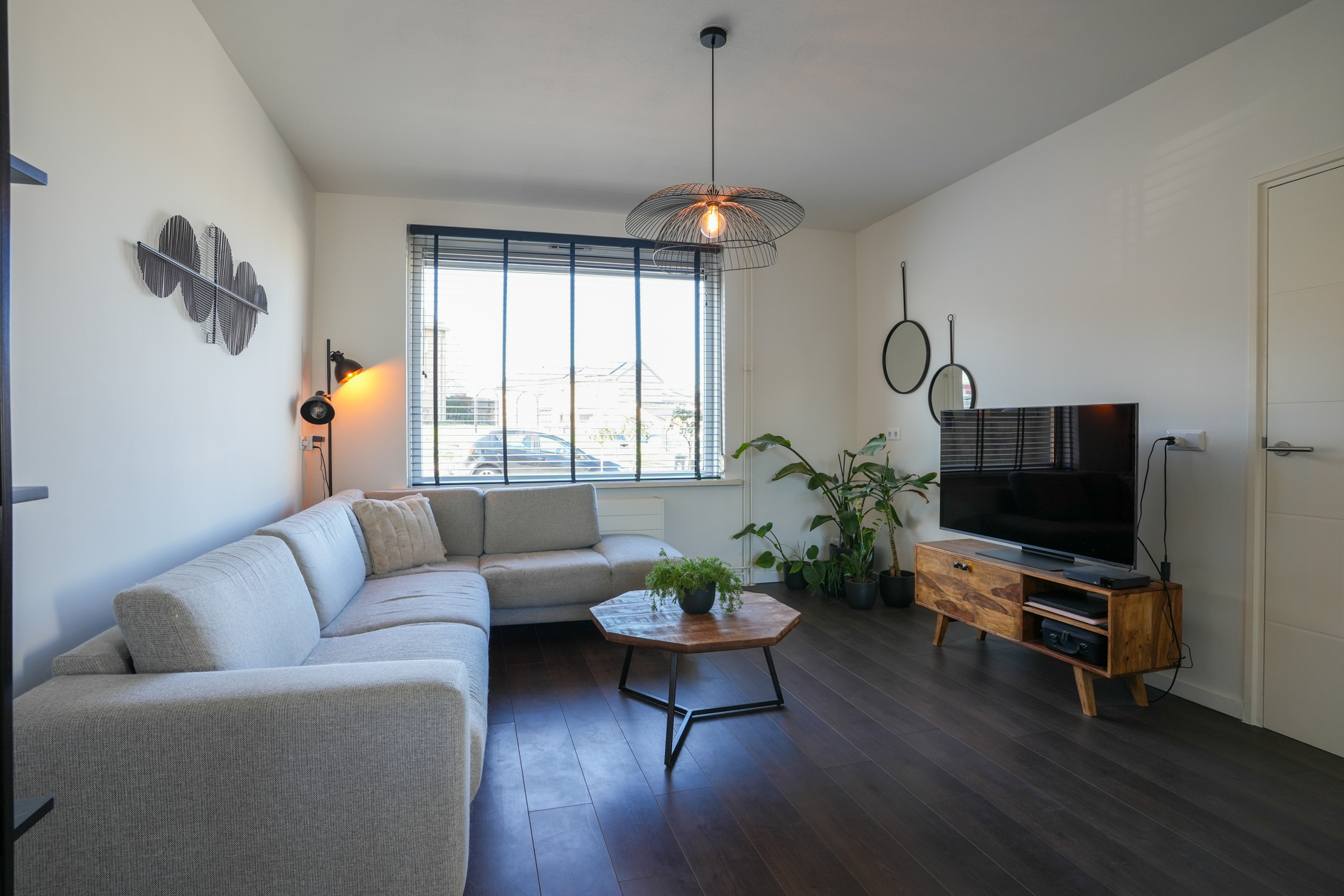 Begane grond, voorzien van laminaatvloer: hal met meterkast; toilet met wandcloset en fonteintje; woonkamer 6.92 x 3.81/2.61 met halfopen keuken met moderne aanbouwkeuken voorzien van inductiekookplaat, afzuigkap, combi-oven, koelkast en vaatwasser; via de keuken heeft men toegang tot het terras.
