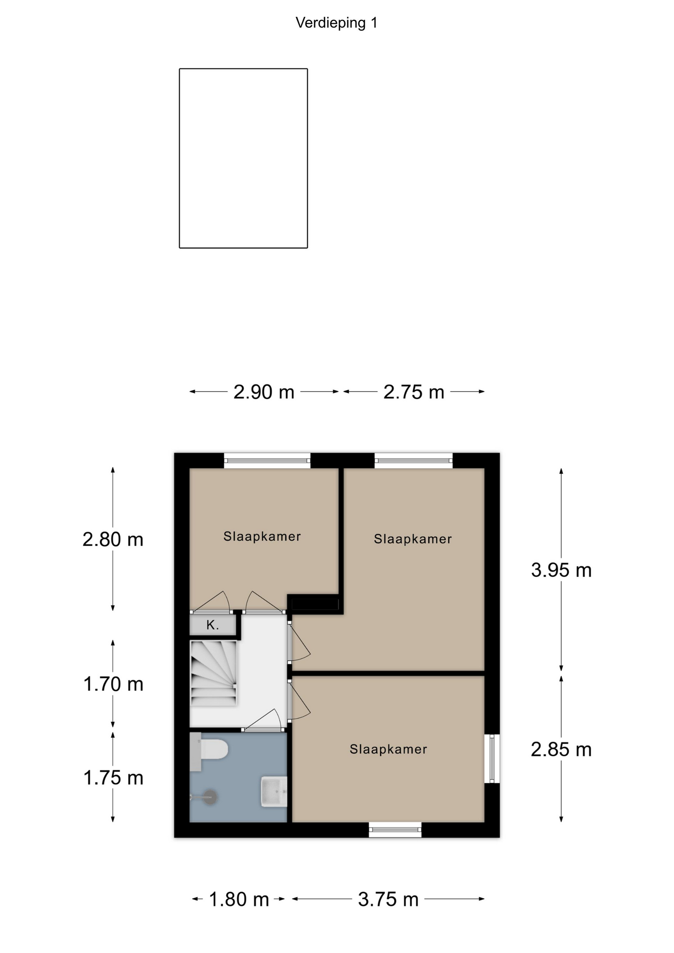 Eerste verdieping: overloop; drie slaapkamers 3.97 x 2.77; 3.78 x 2.86; 2.90 x 2.75 met muurkast; badkamer 1.82 x 1.71 met inloopdouche, 2e toilet, badmeubel met wastafel.