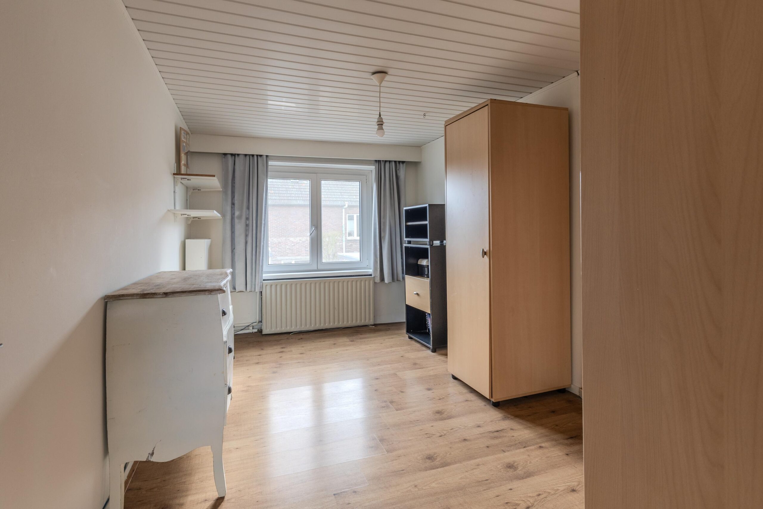 Op de begane grond bevindt zich de ouderslaapkamer met laminaatvloer, een lichtkoepel en directe toegang tot het overdekte terras – ideaal als slaapkamer, werkruimte of gastenverblijf.