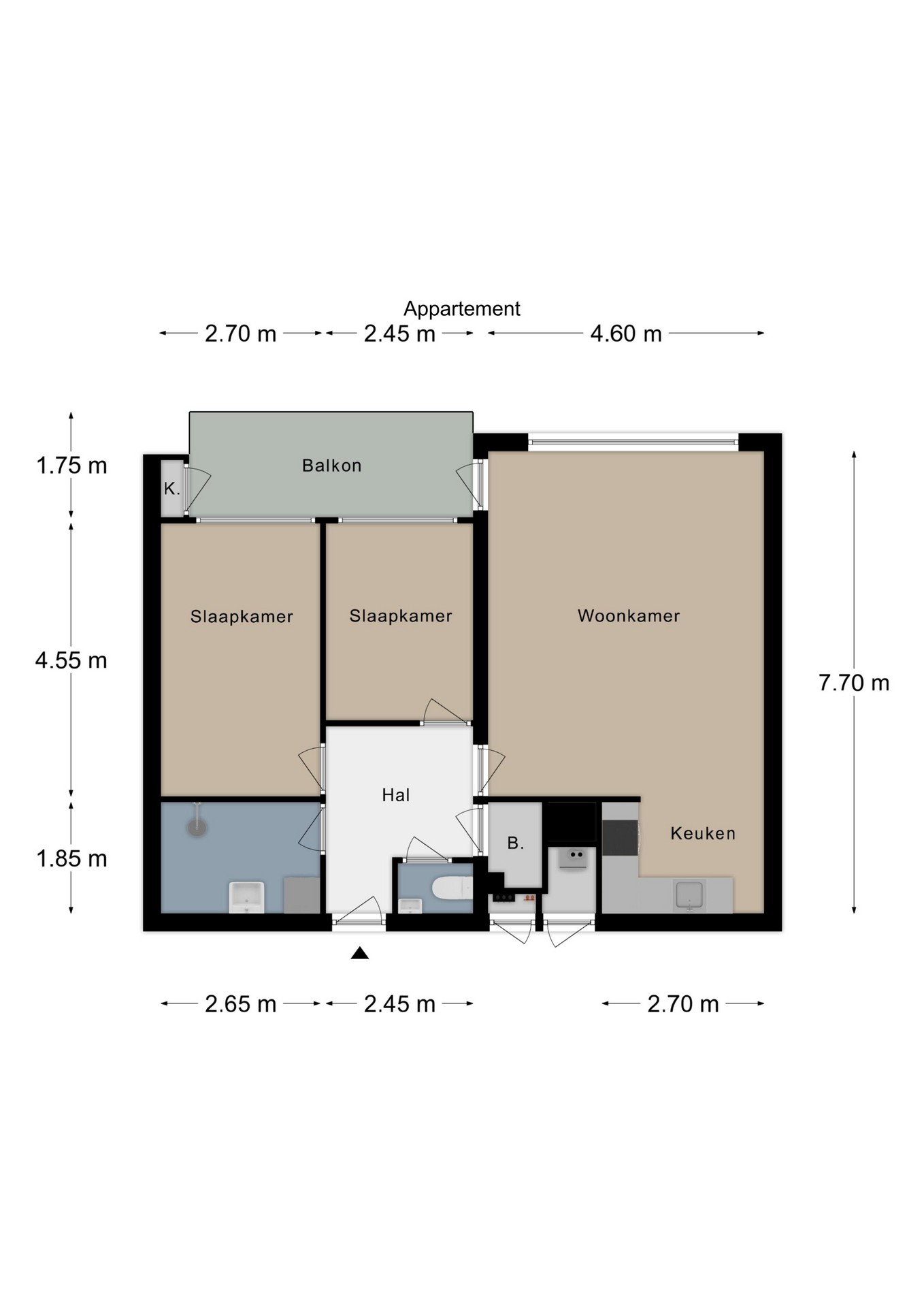 Indeling: hal; berging; toilet met fonteintje; woonkamer 5.80 x 4.60 met deur naar balkon; open keuken 2.70 x 1.85 met eenvoudige aanbouwkeuken; twee slaapkamers 4.55 x 2.70; 3.30 x 2.45; badkamer 2.70 x 1.85 met inloopdouche, wastafel en aansluiting wasmachine.