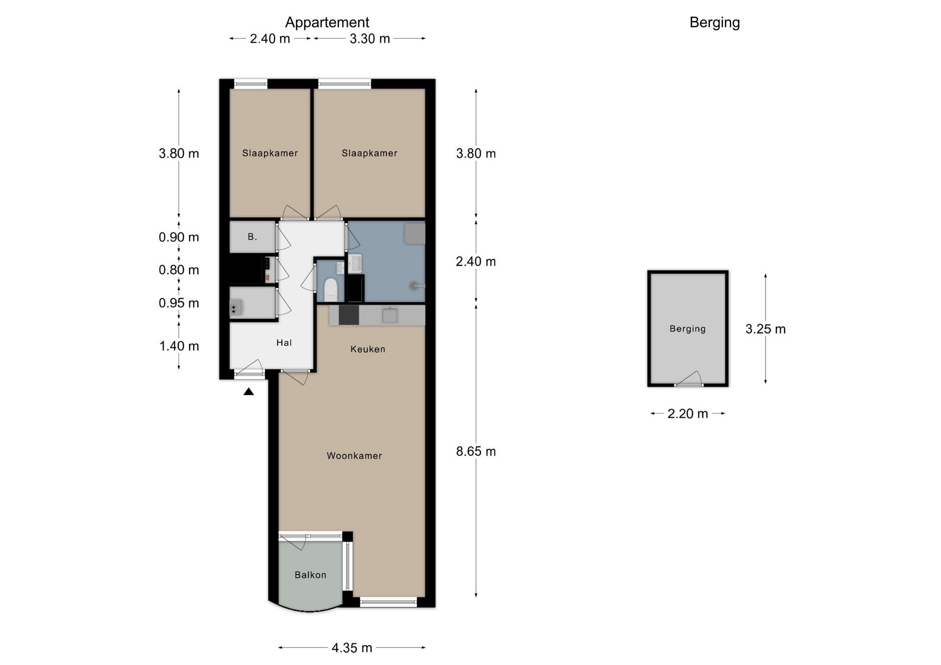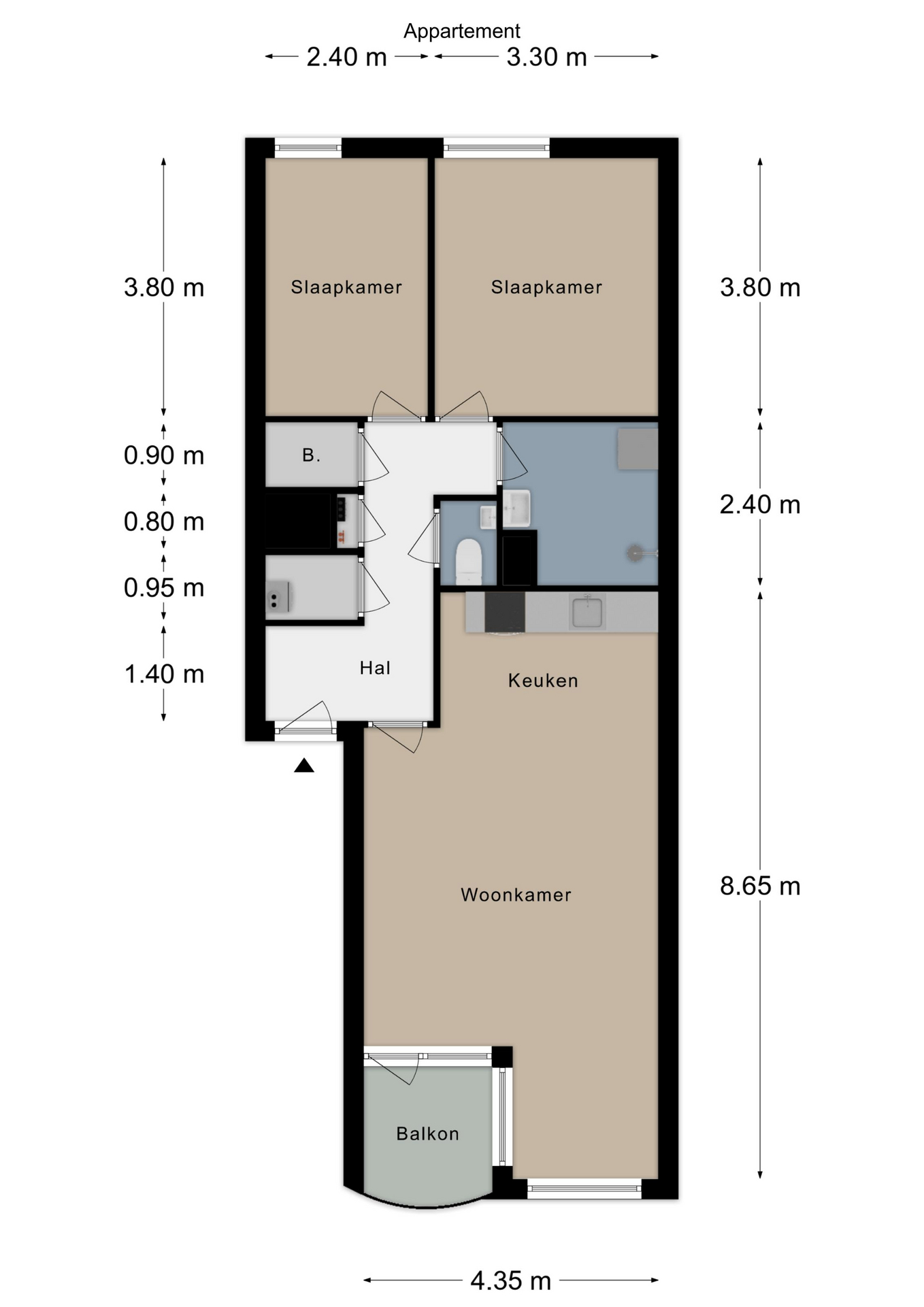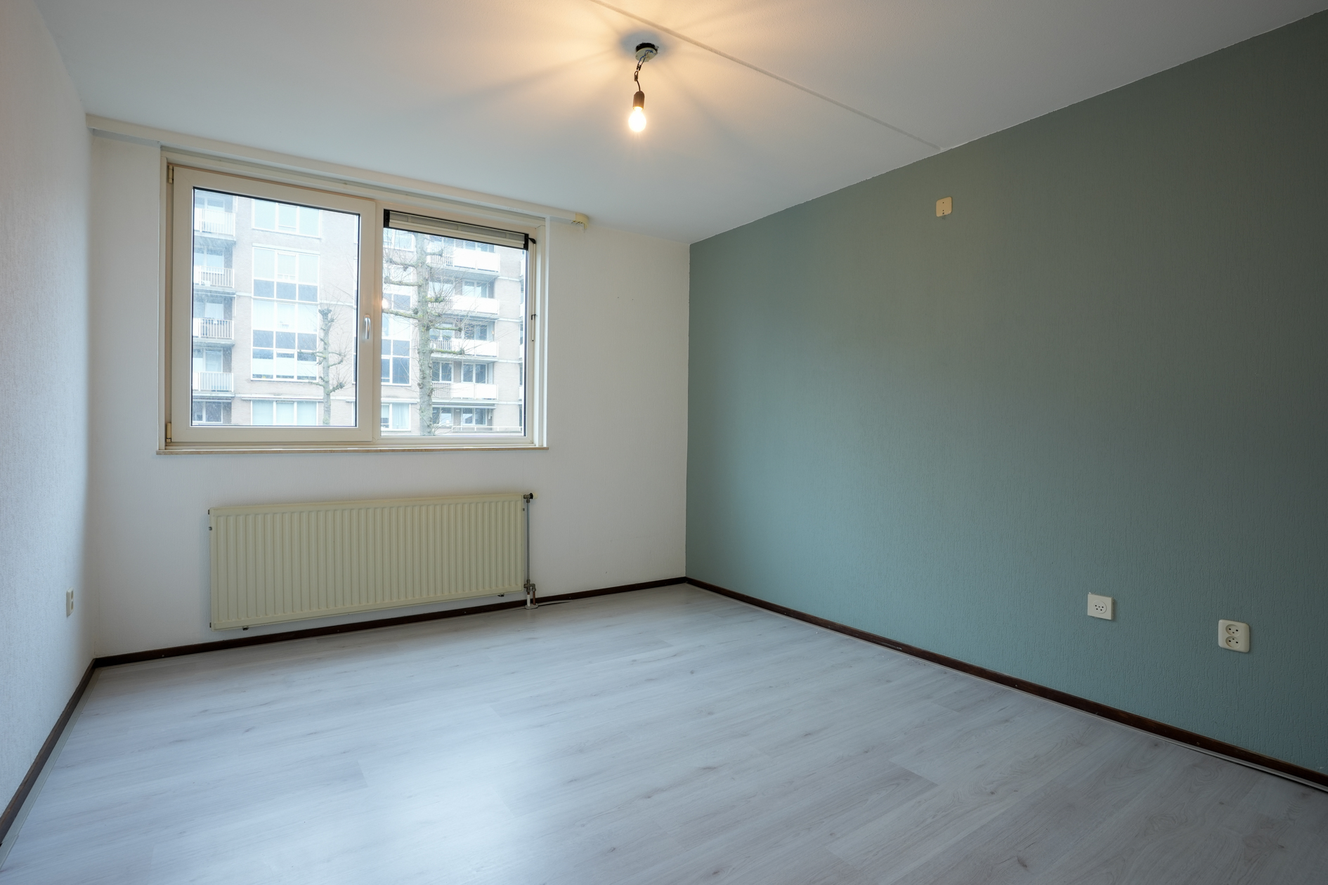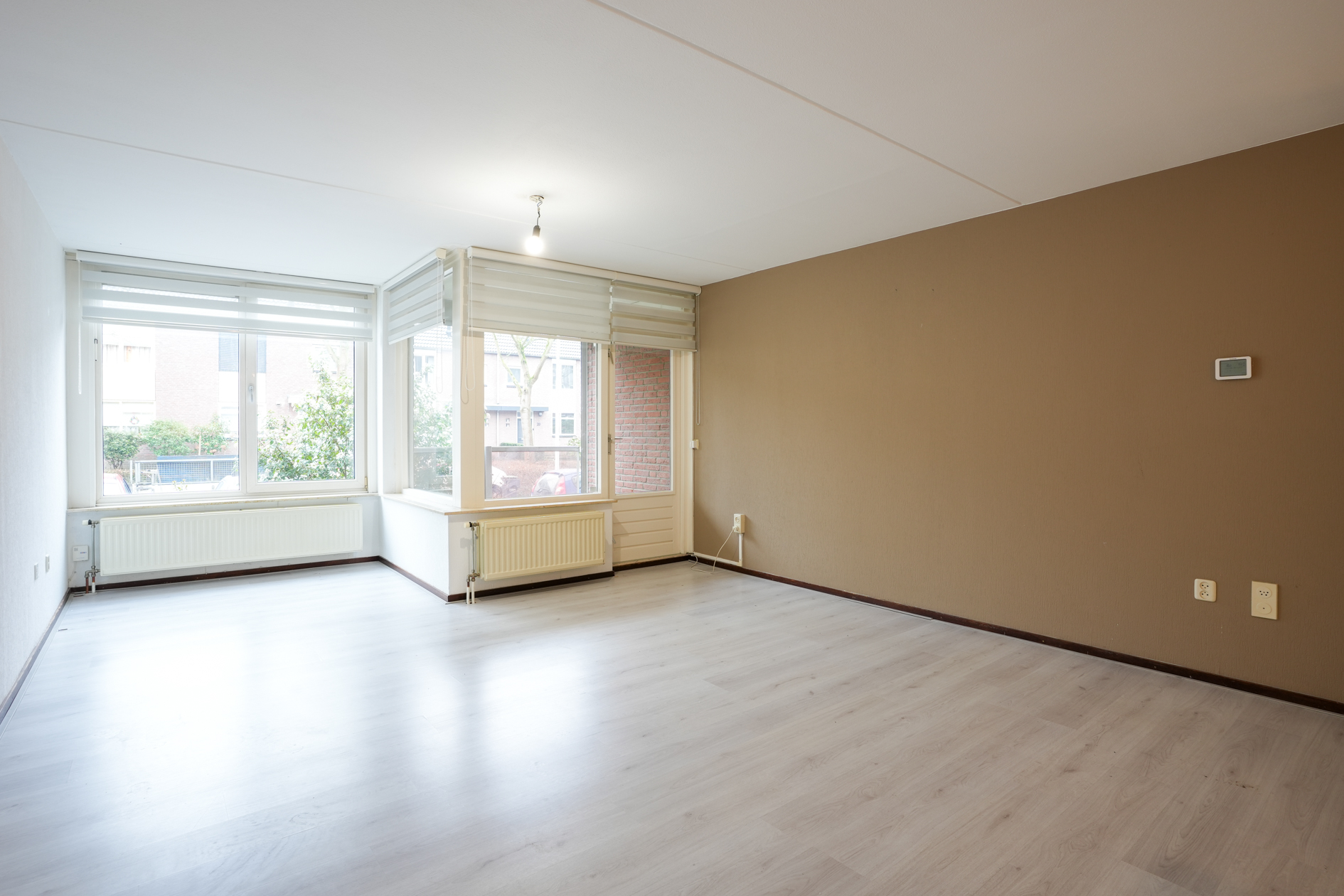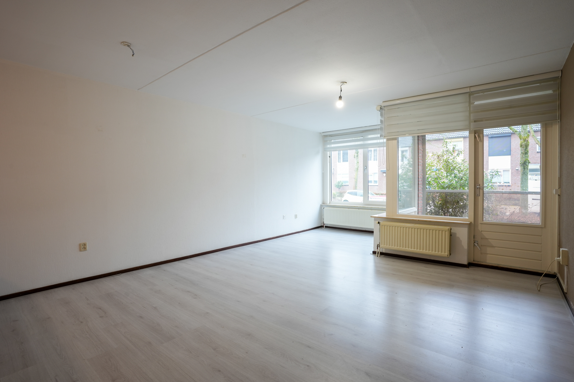 Appartement op eerste woonlaag voorzien van laminaatvloer (m.u.v. badkamer, toilet en slaapkamers): hal/entree; meterkast; cv-ruimte; bergkast; woonkamer met veel lichtinval, en een open keuken voorzien van een keukenblok met inductiekookplaat afzuiging en bovenkasten; vanuit de woonkamer heeft men toegang naar balkon aan voorzijde; twee slaapkamers 3.80 x 3.30 en 3.80 x 2.40; badkamer met inloopdouche, wastafel en aansluiting wasapparatuur.