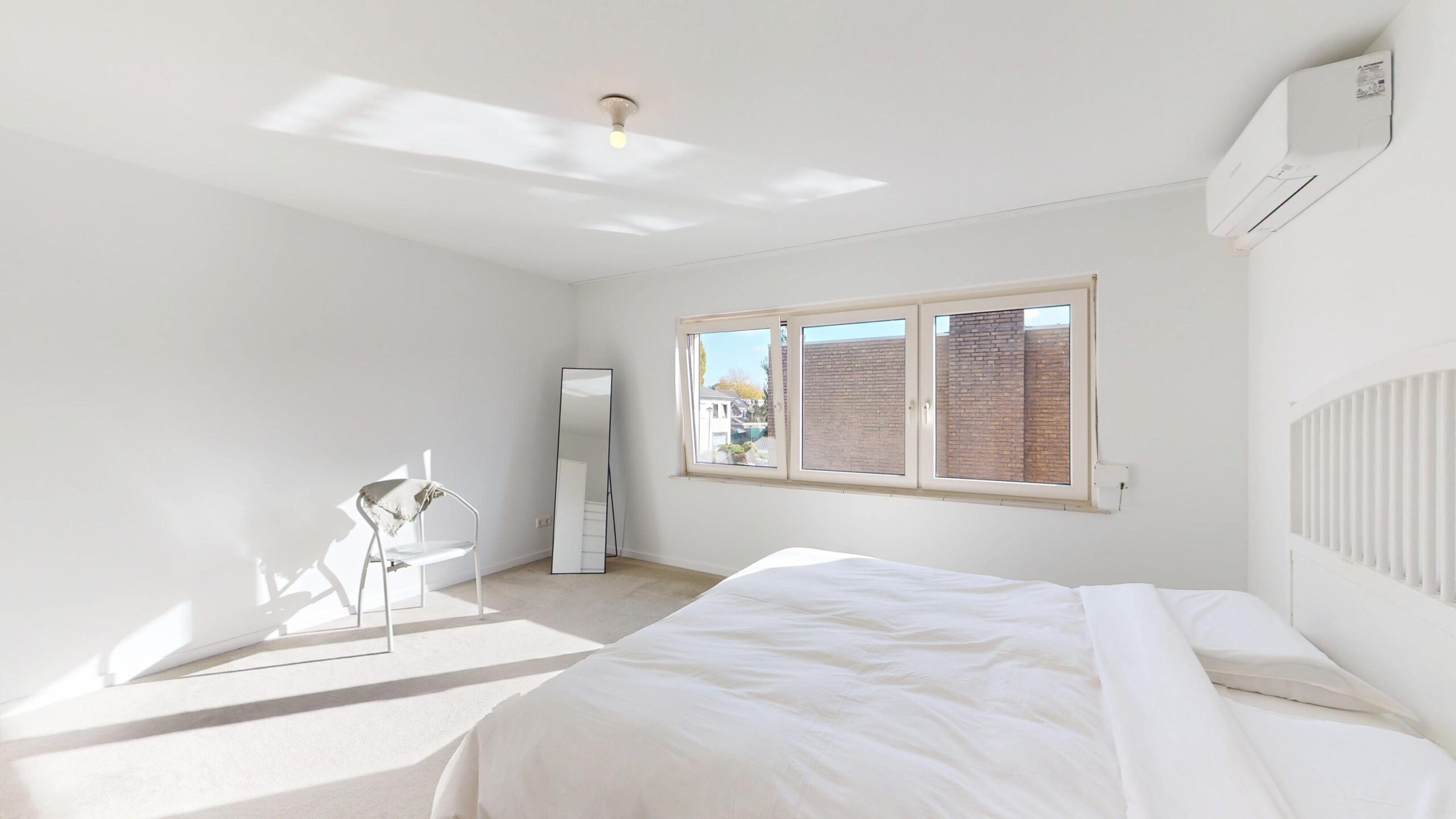 Eerste verdieping: overloop met veel lichtinval; separaat toilet met wandcloset; drie slaapkamers 4.44 x 3.98 met airconditioning (inverter), 3.95 x 3.27 met muurkast; 3.30 x 2.43 met muurkast; badkamer 2.38 x 1.42 met vloerverwarming, douchecabine en badmeubel.