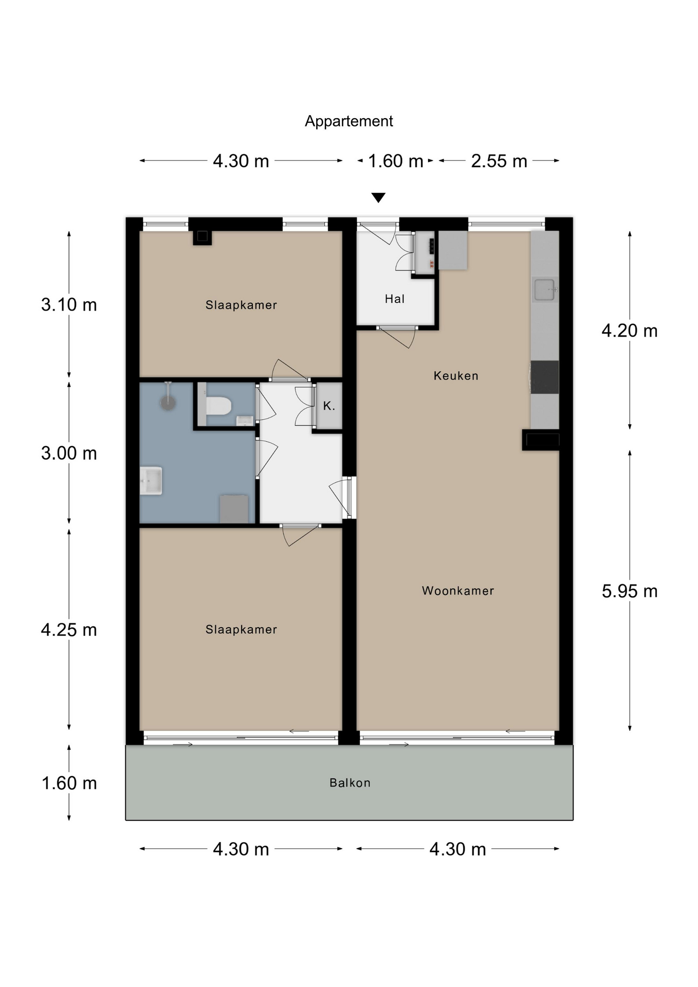Portaal met vaste kasten en toegang naar separaat toilet met wandcloset en fonteintje; slaapkamer I, 4.30 x 4.25 met grote schuifpui naar balkon, slaapkamer II 4.30 x 3.06; moderne badkamer met inloopdouche, badmeubel en wasmachine-aansluiting.