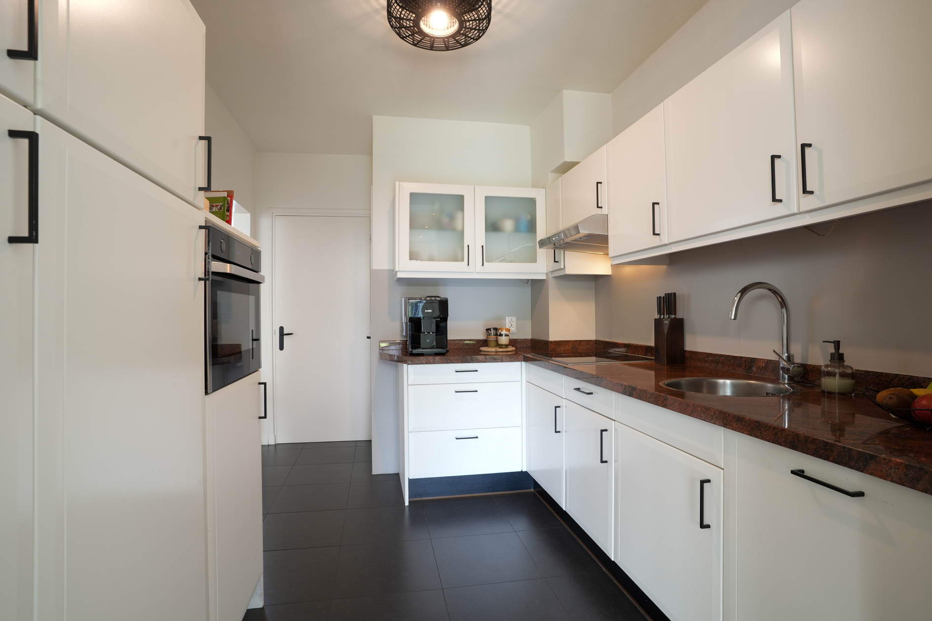 Begane grond: entreehal met tegelvloer, bergkast en meterkast; modern toilet met wandcloset en fonteintje; woonkamer 7.61 x 3.77 met parketvloer en mooie lichtinval; aanbouw/eetgedeelte 6.34 x 3.06 met tegelvloer en deur naar de tuin en oprit; halfopen keuken 2.96 x 2.53 met aanbouwkeuken voorzien van keramische kookplaat, afzuigkap, combi-oven, vaatwasser, koelkast en granietblad.