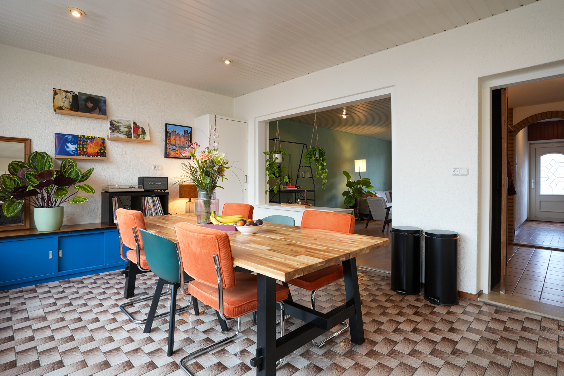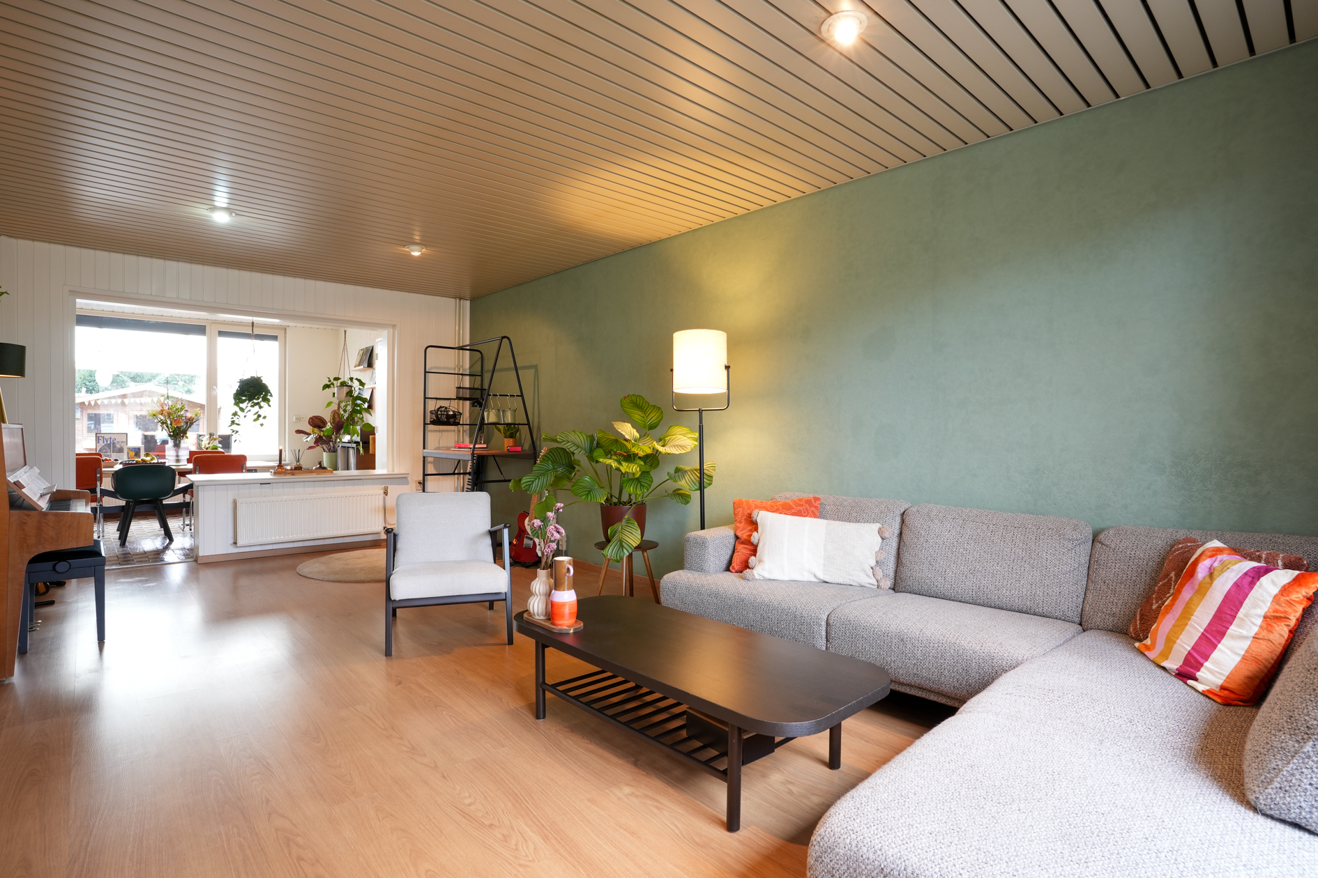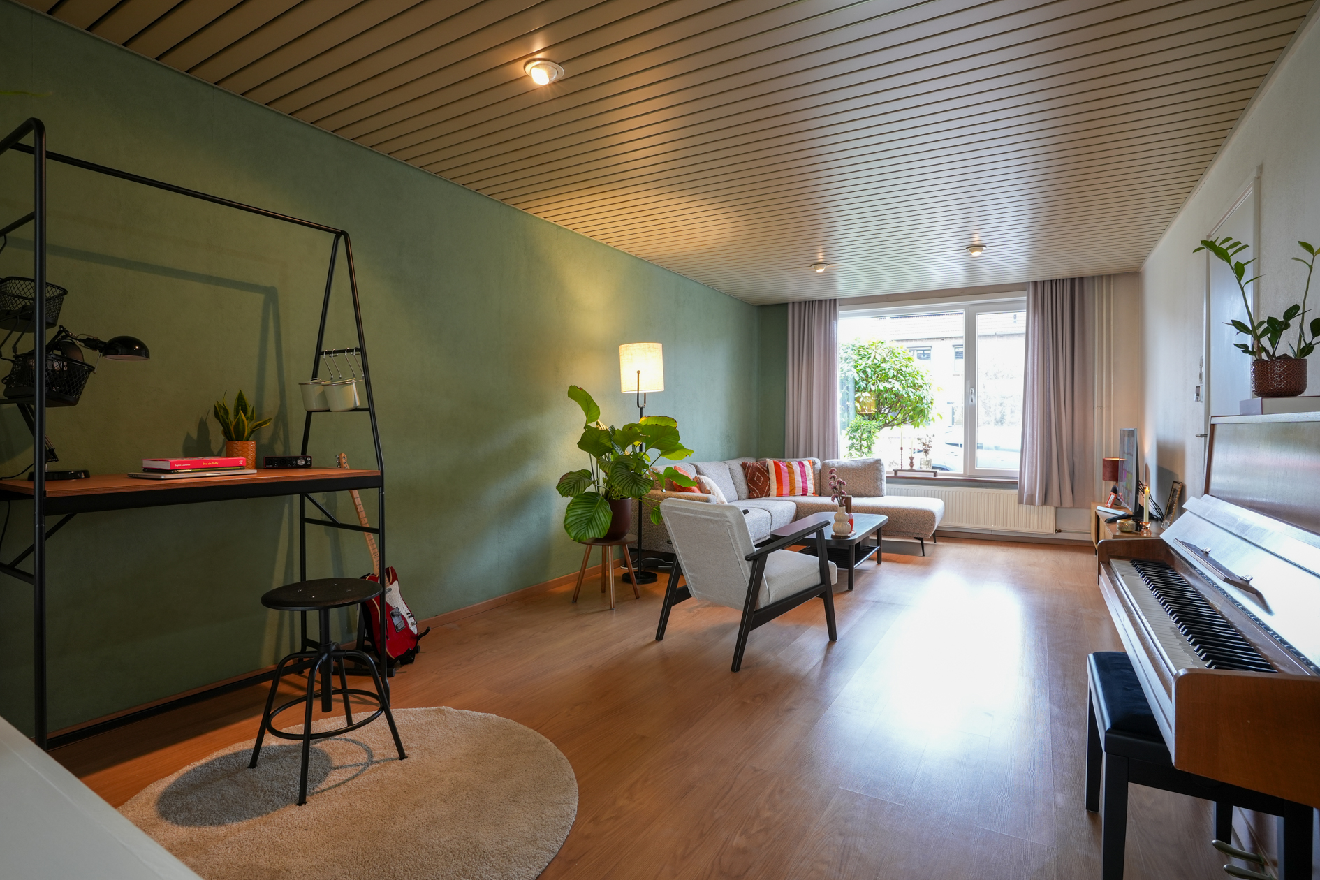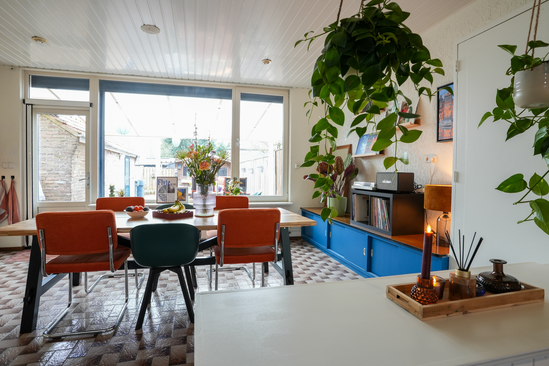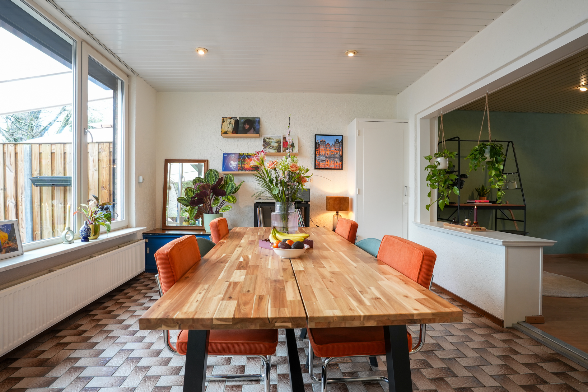 Begane grond: hal met tegelvloer en meterkast; modern toilet met wandcloset; portaal met toegang naar het souterrain; woonkamer 6.90 x 3.68 met laminaatvloer; aanbouw met tegelvloer en leef keuken 5.58 x 3.71 met aanbouwkeuken voorzien van granietblad, gasfornuis, afzuigkap, koelkast, combi-oven, vaatwasser; vanuit de keuken heeft men toegang naar de tuin.