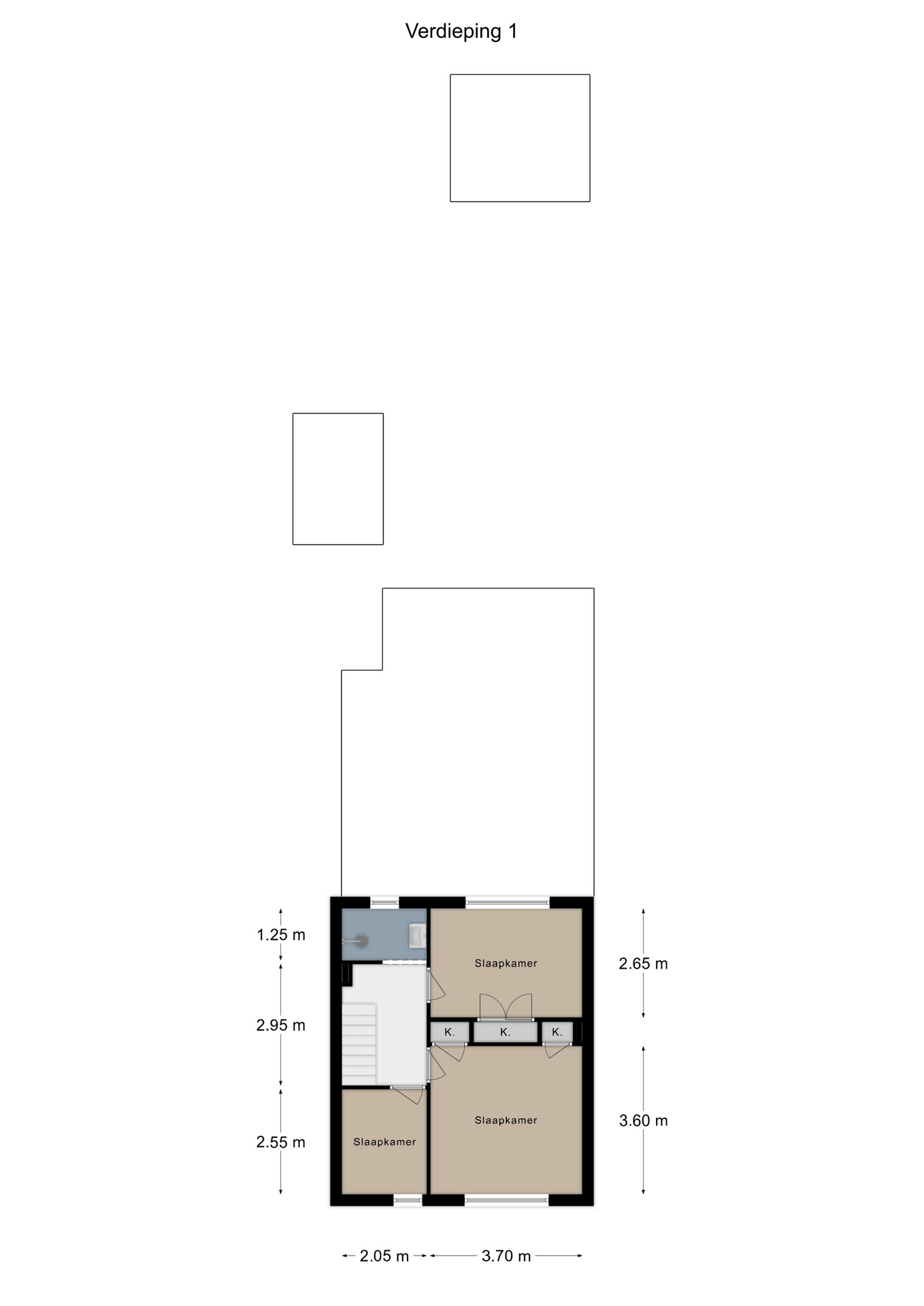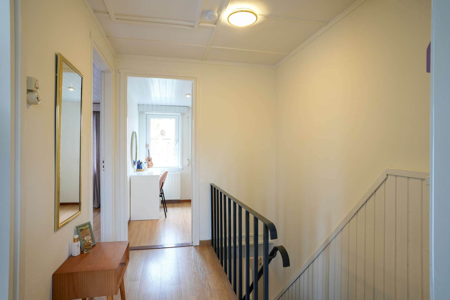 Eerste verdieping, voorzien van laminaat-vloer (m.u.v. badkamer): ruime overloop; drie slaapkamers 3.70 x 3.60 met muurkast; 3.70 x 2.68 met dubbele muurkast; 2.57 x 2.05; badkamer met douche en wastafel.
