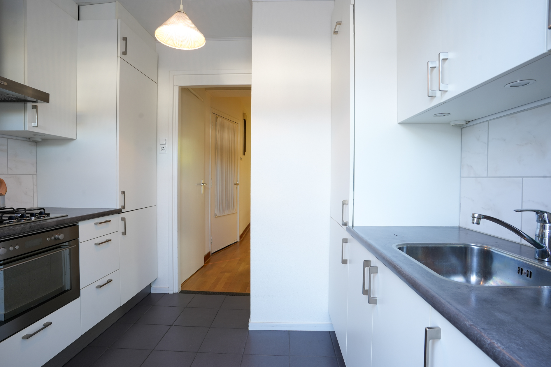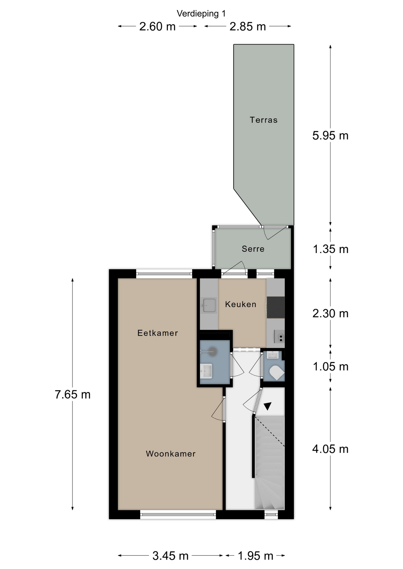 Eerste verdieping: entreehal met meterkast; separaat toilet met fonteintje; badkamer 1.62 x 1.05 met douchecabine en wastafel; woonkamer 7.64 x 3.48/2.60 met lamel-parketvloer en veel lichtinval middels grote raampartijen; gesloten keuken met nette aanbouwkeuken voorzien van gaskookplaat, afzuigkap, oven, koel-vriescombinatie; standplaats cv-ketel; toegang tot eenvoudige serre, alwaar aansluiting droger en toegang naar de tuin.