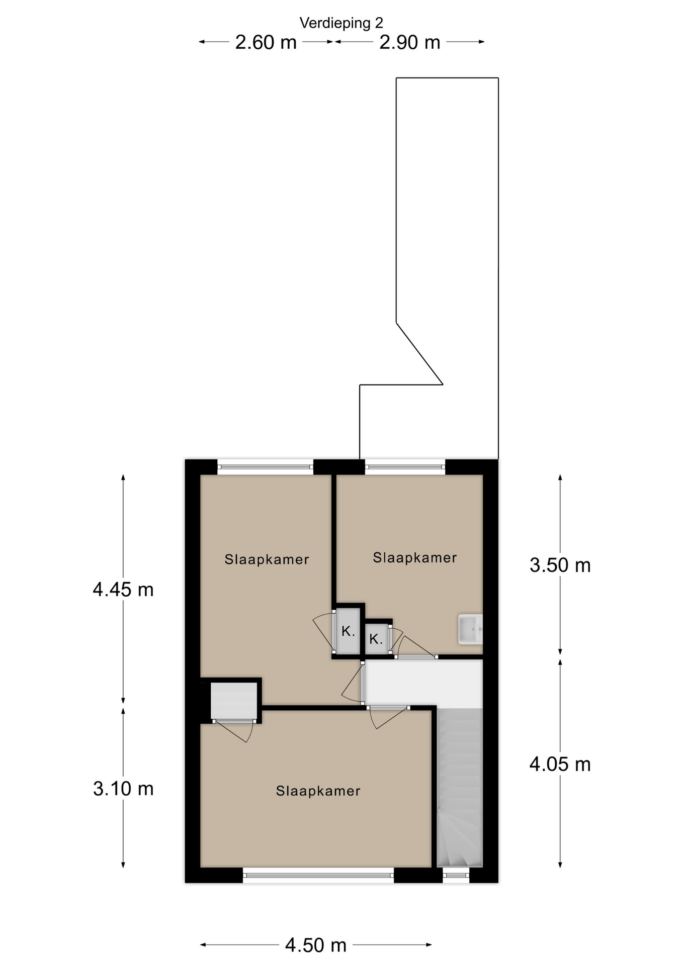 Tweede verdieping: overloop; drie slaapkamers 4.50 x 3.09 met toegang naar de bergzolder; 4.46 x 2.60 met muurkast; 3.50 x 2.88 met vaste kast en wastafel.