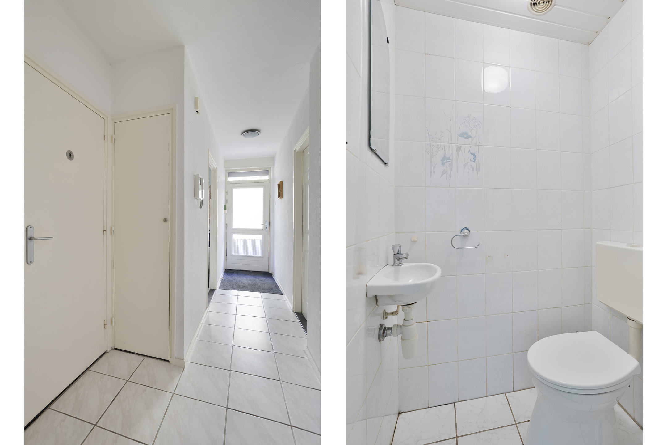 Via de galerij toegang tot het appartement. De hal is voorzien van een plavuizen vloer en een toiletruimte met duoblok en fonteintje.