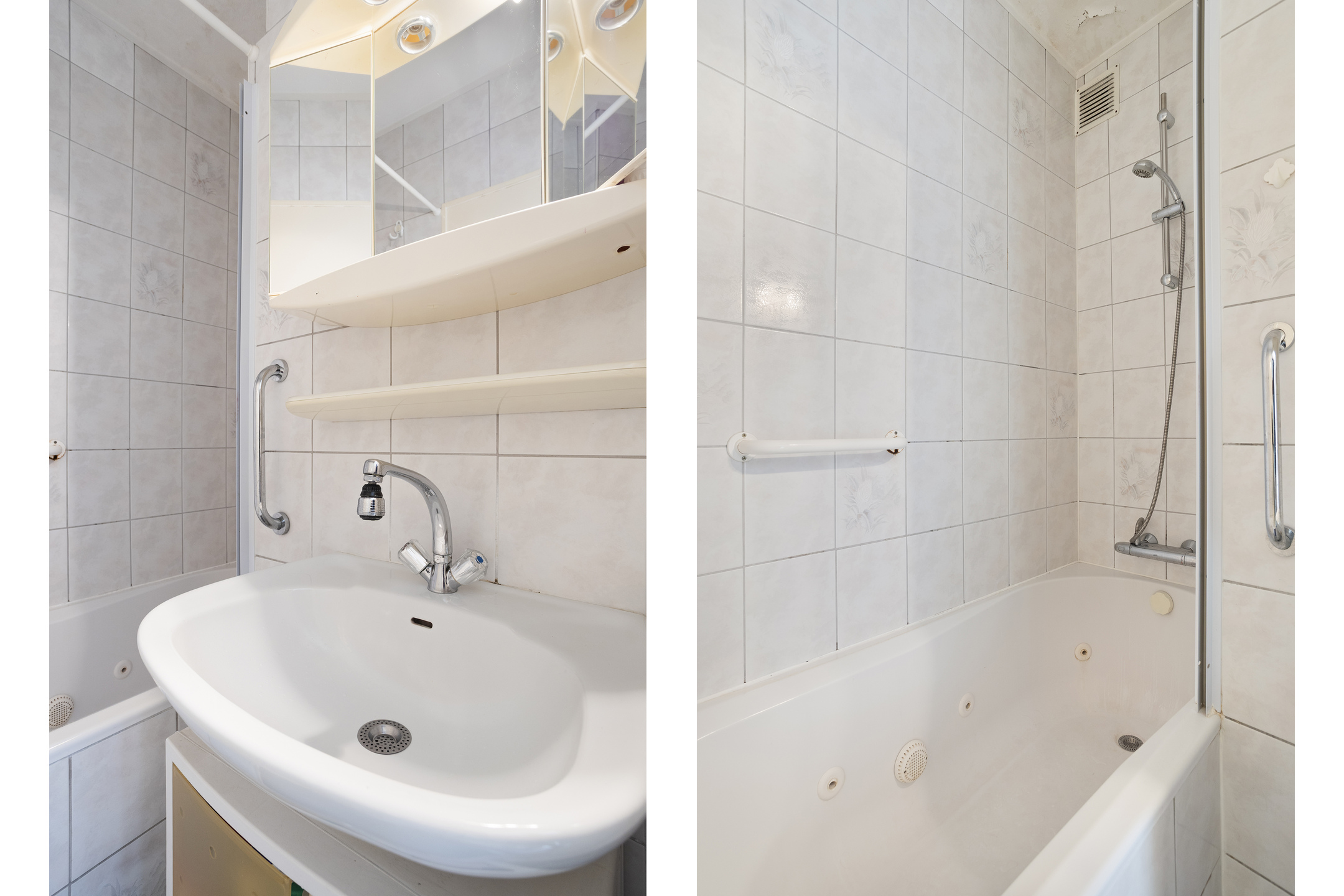 De badkamer is geheel licht betegeld en voorzien van een wastafel met spiegelkast en een ligbad.