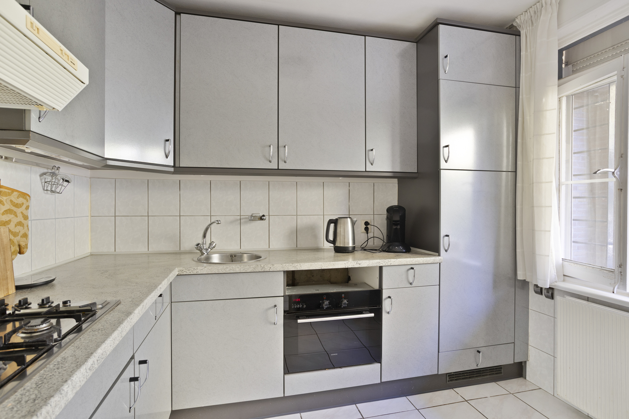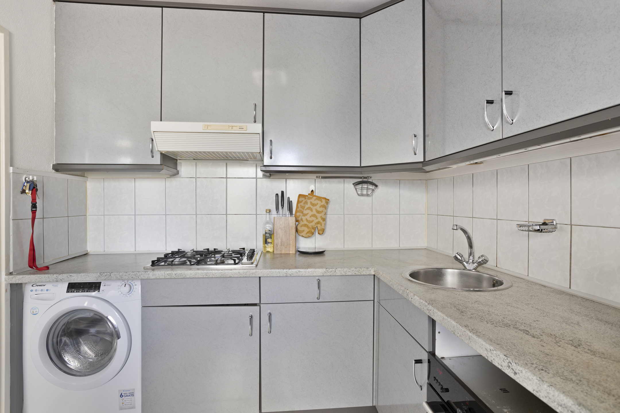 De gesloten keuken (ca. 2.95 x 2.40 m) beschikt over een nette hoekopstelling met diverse inbouwapparatuur, waaronder een gaskookplaat, afzuigkap, koelkast, vriesvak, oven en aansluiting voor de wasmachine.