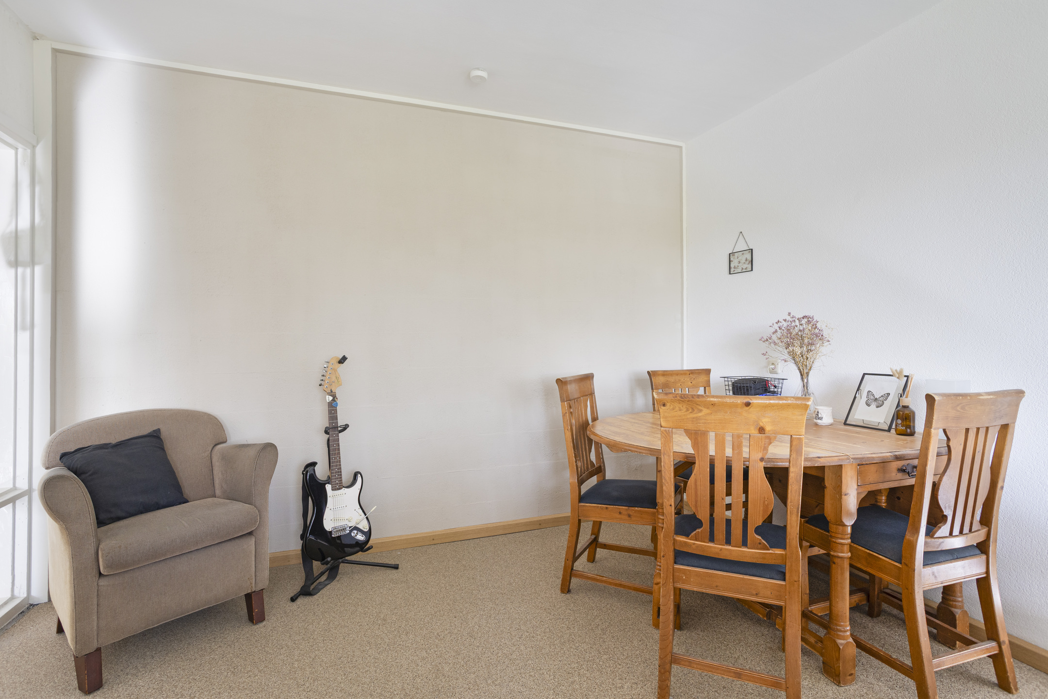 De ruime woonkamer met grindvloer biedt veel lichtinval en een prettig uitzicht.