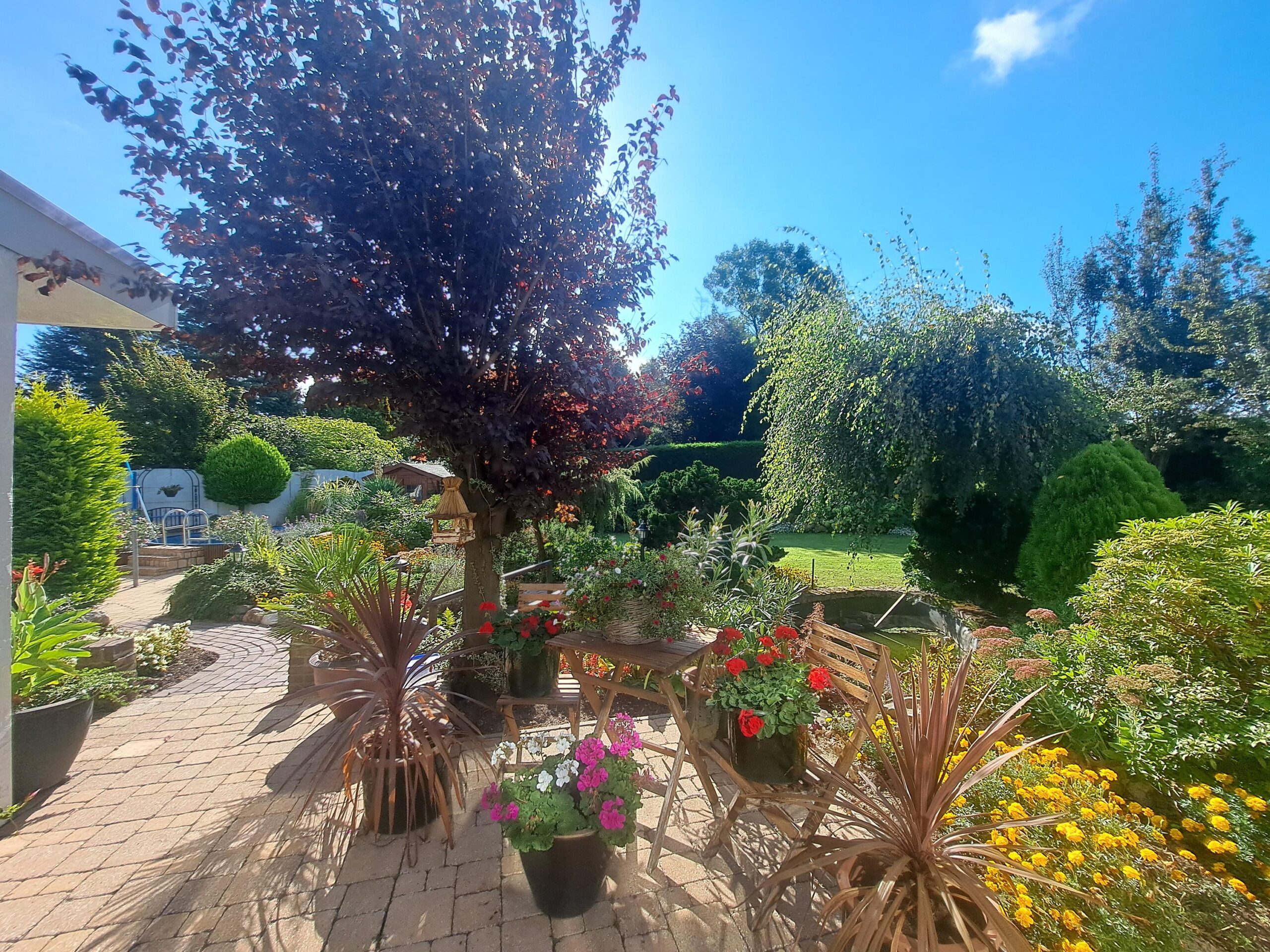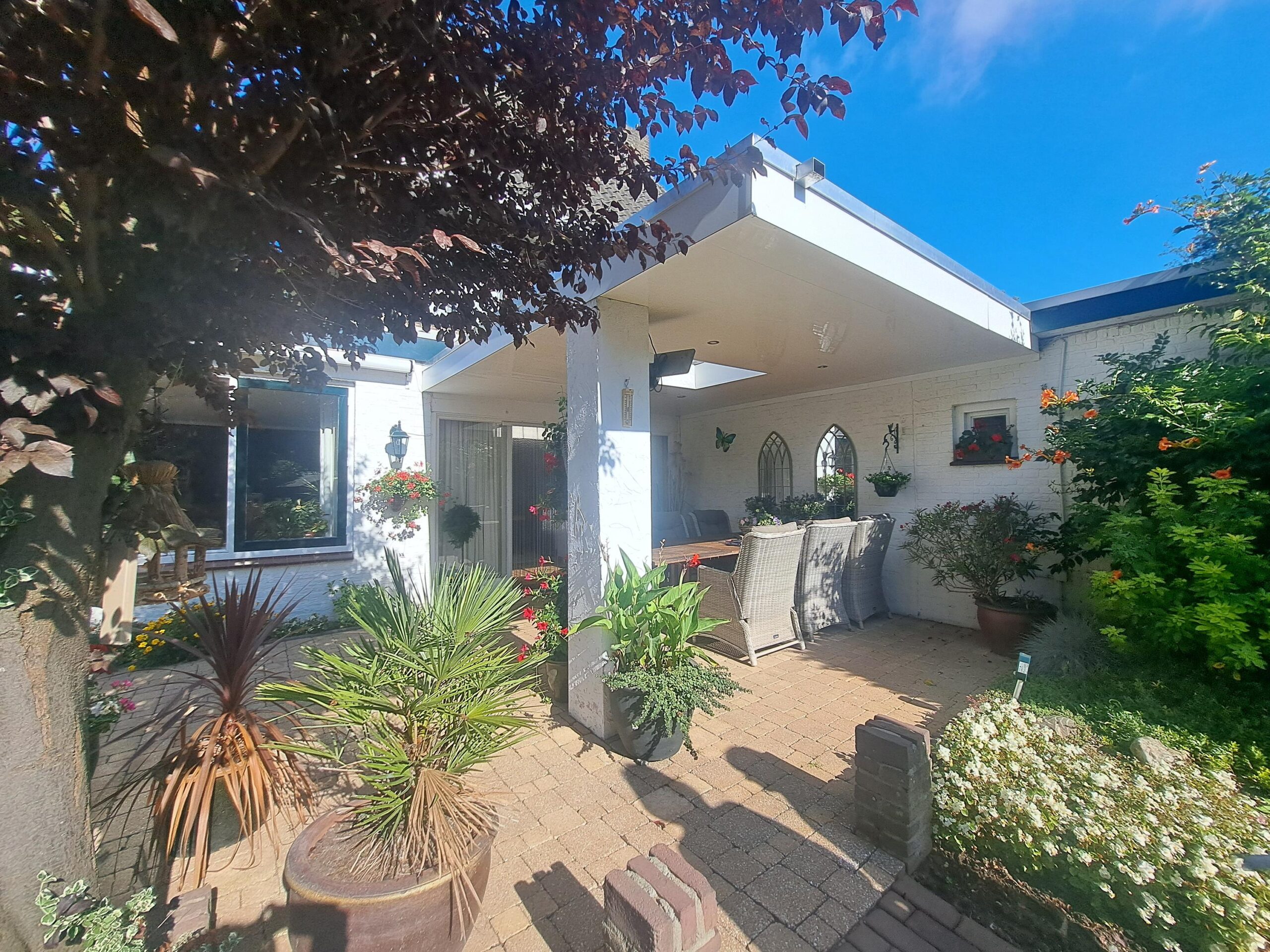 Begane grond, voorzien van tegelvloer: ruime hal met meterkast; toilet met fonteintje; L-woonkamer met schouw en inzethaard, erker, airconditioning; zij-aanbouw 5.75 x 4.45 met mooi tuincontact, thans in gebruik als zitkamer; gesloten keuken met aanbouwkeuken voorzien van inductiekookplaat, afzuigkap, vaatwasser, koelkast; toegang naar tussenportaal 3.15 x 3.00 met deur naar oprit en toegang naar de salon.