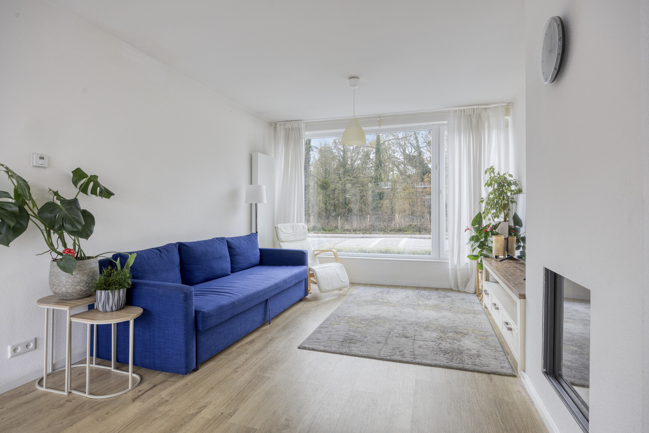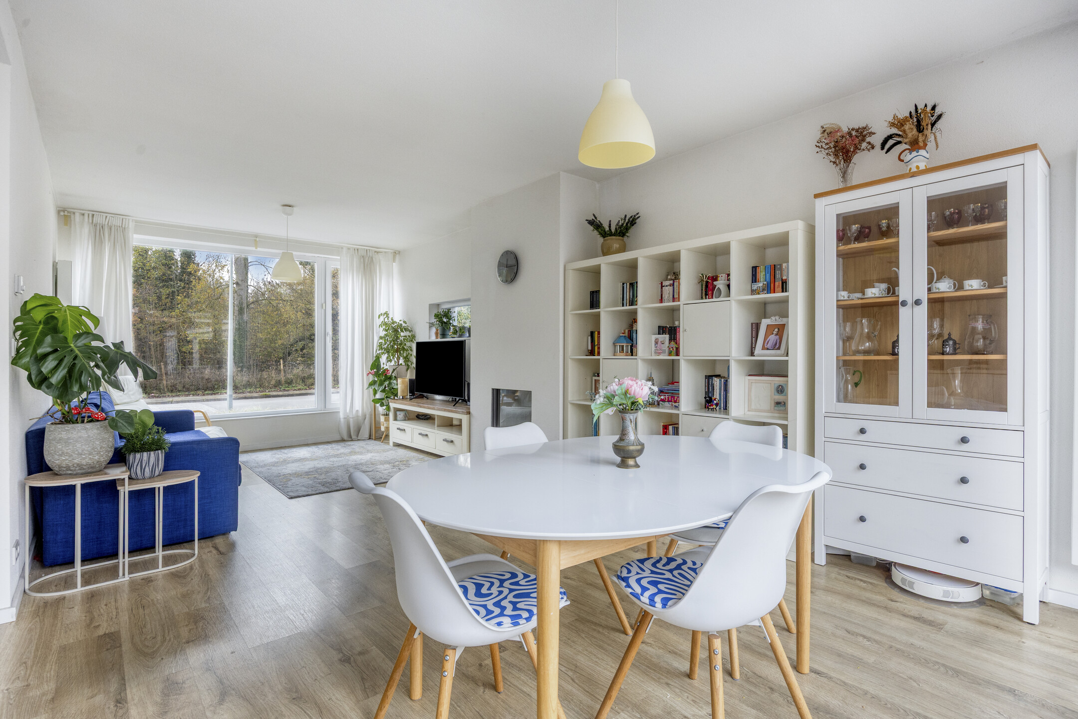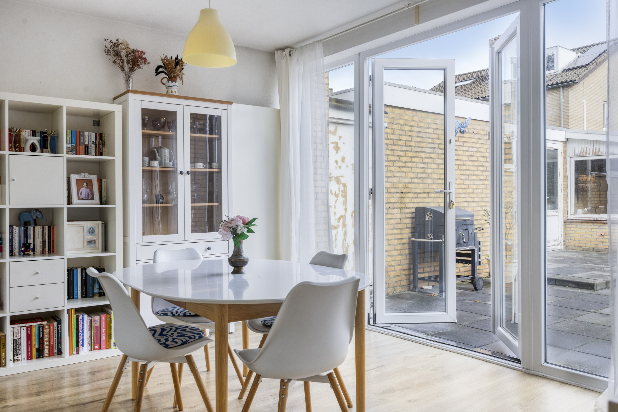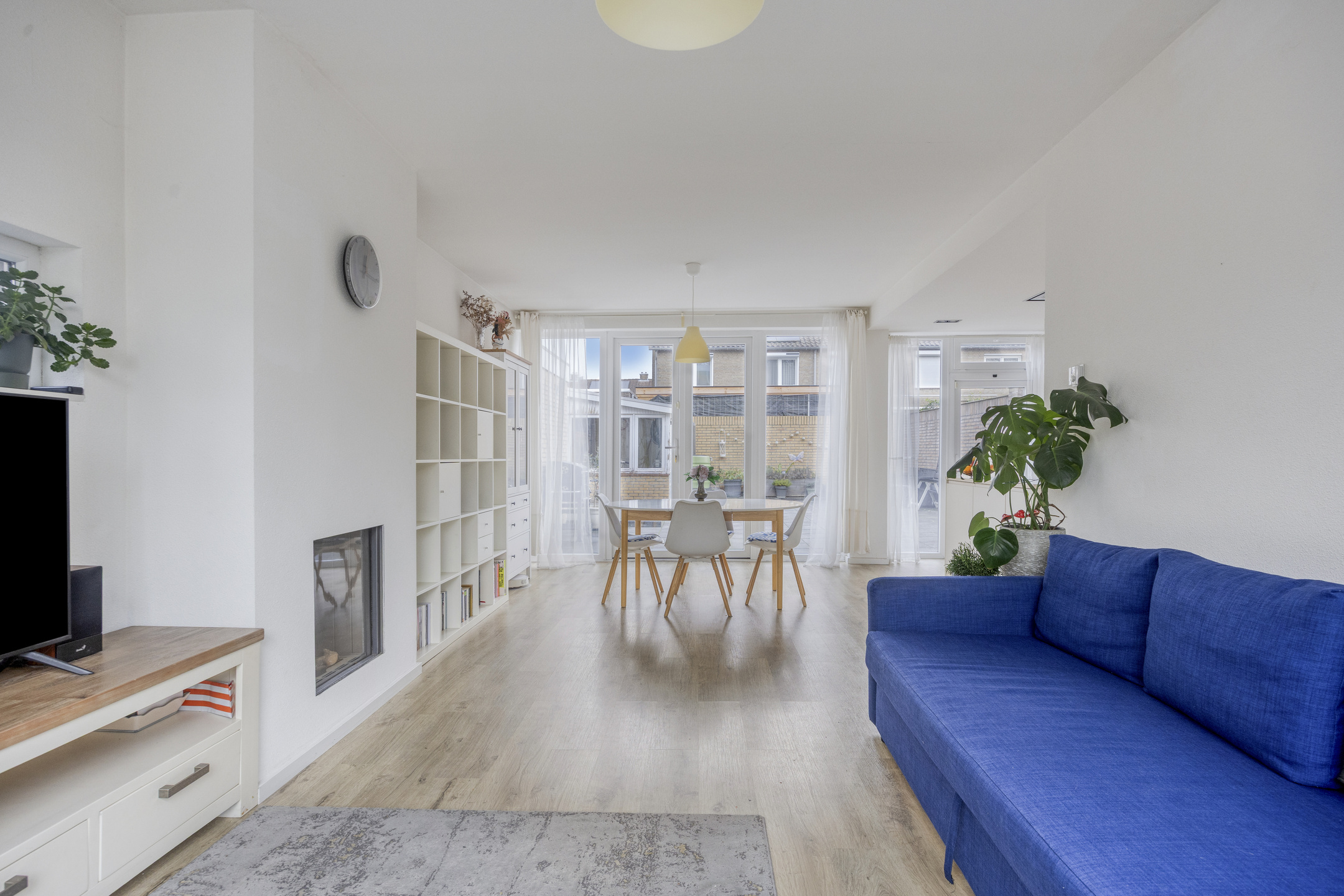 De woonkamer is voorzien van een mooie en praktische laminaat vloer. Via de openslaande deuren bereik je de ruime, onderhoudsvriendelijke achtertuin gelegen op het oosten.
