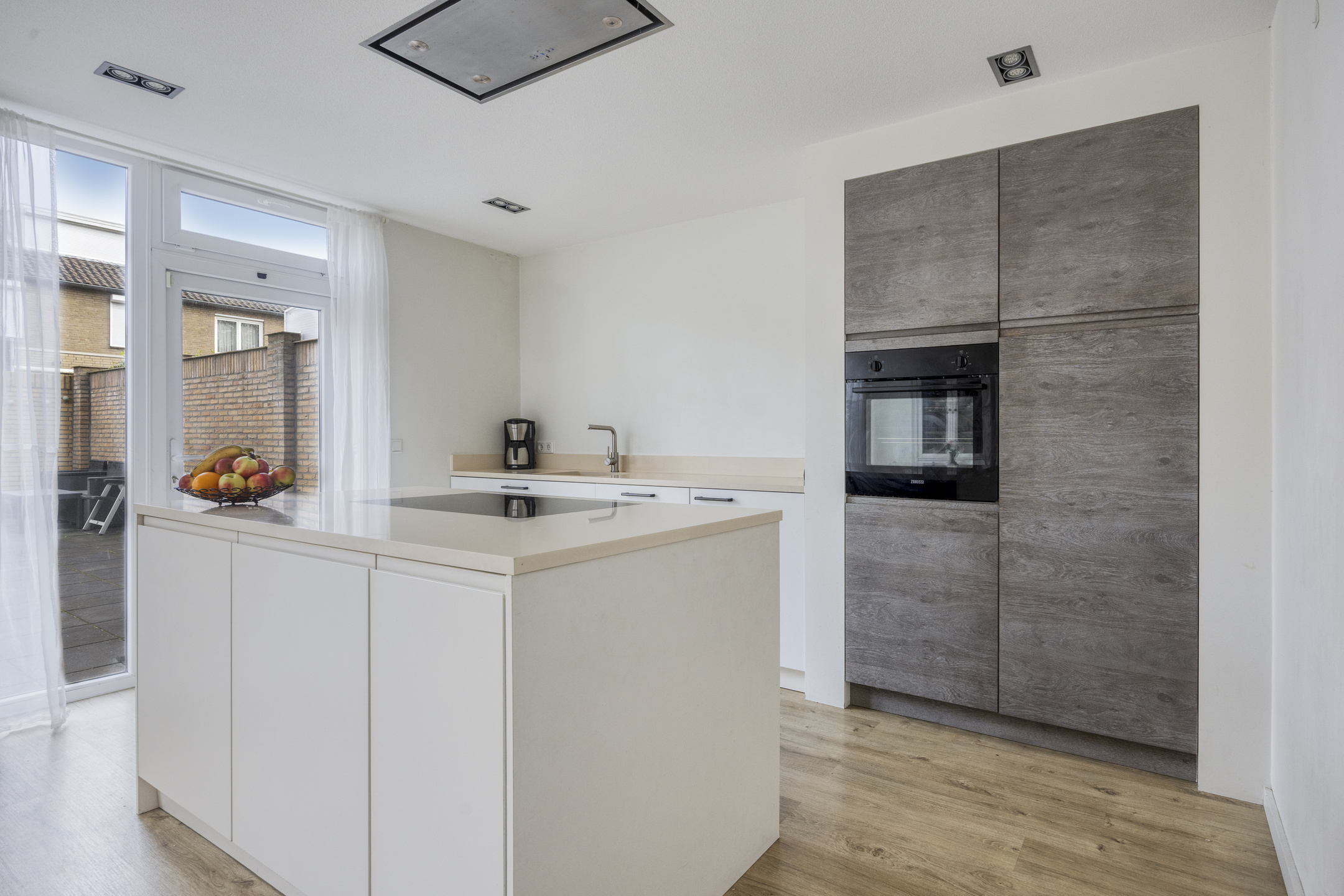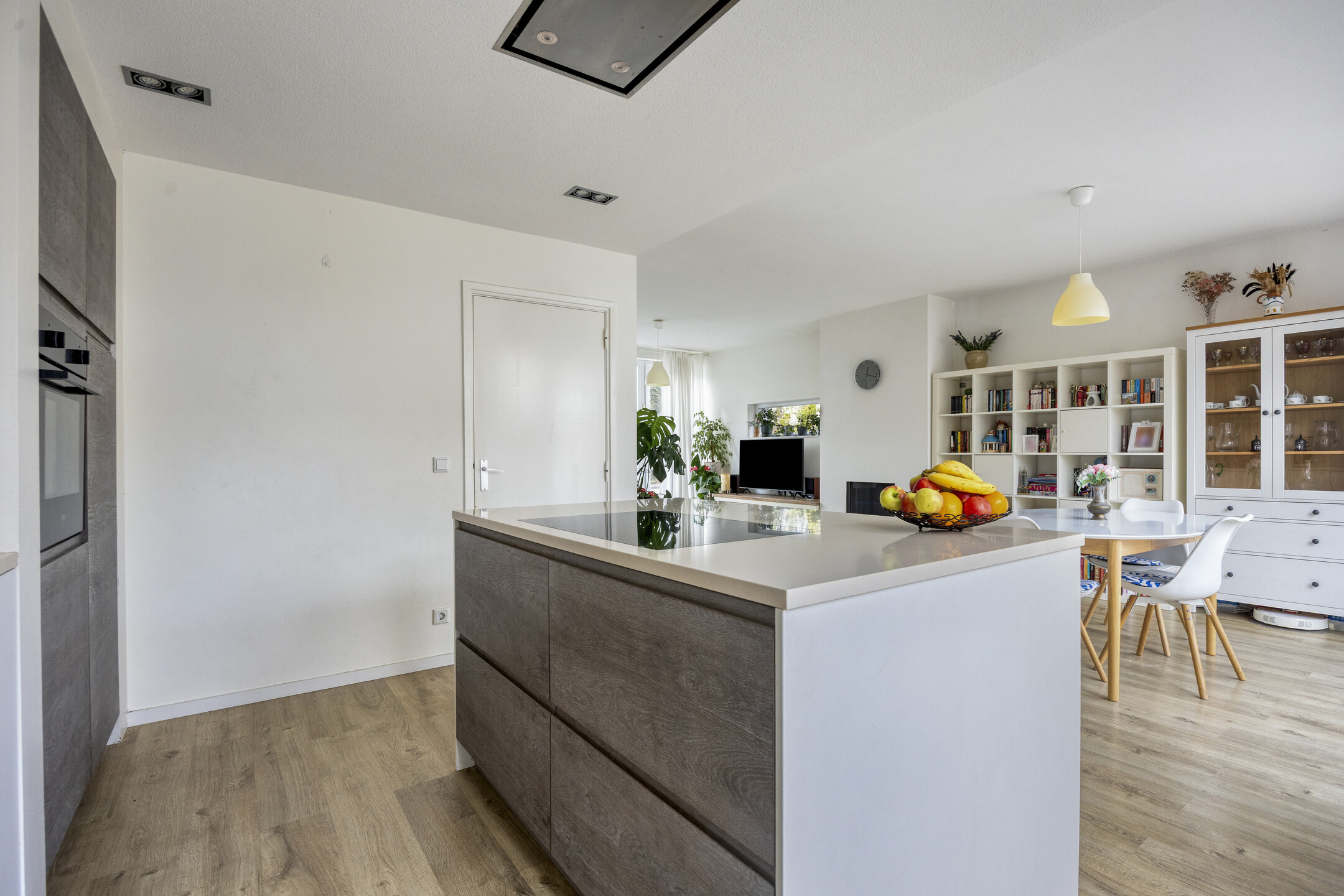 Vanuit de ruime entree met toegang tot toilet, meterkast en kelderkast kom je binnen in de lichte open woonkamer met eetkamer. De moderne keuken met kookeiland is van alle gemakken voorzien (oven, inductie kookplaat, vaatwasser (2025) en koelkast).